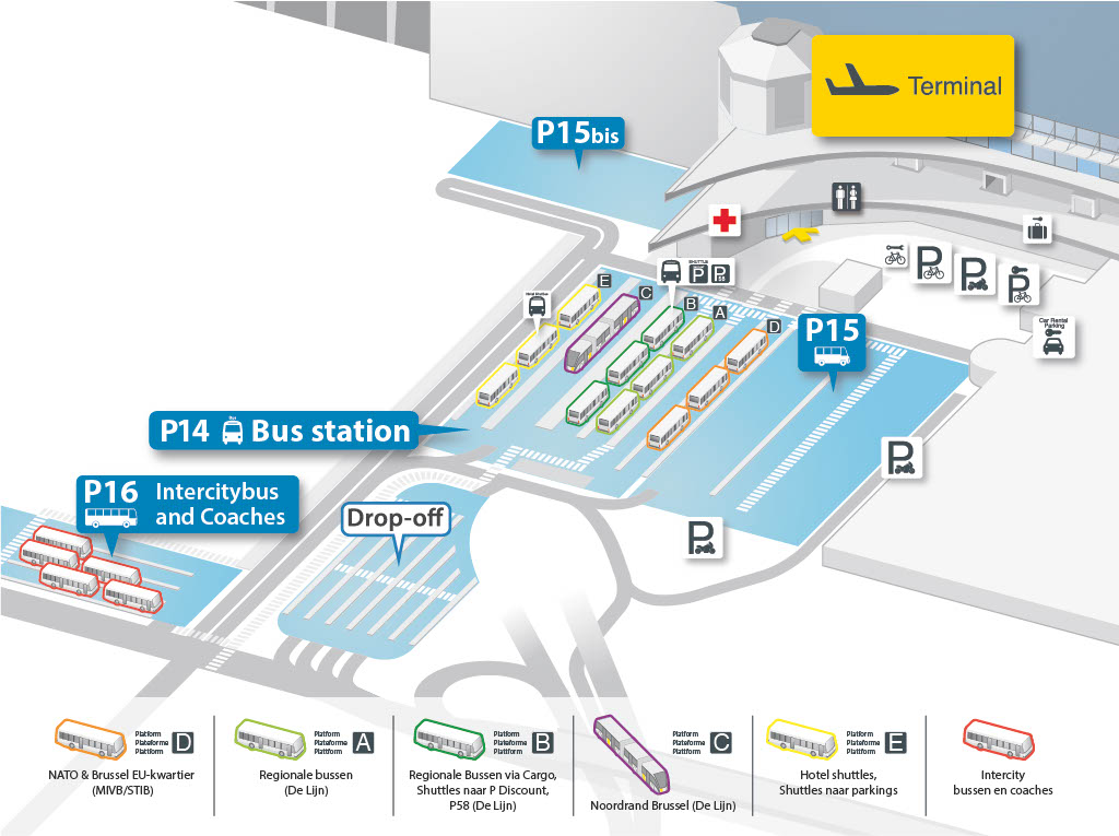 La station de bus se situe juste en dessous du hall des arrivées, au niveau 0. Vous pouvez y accéder en empruntant les escalateurs ou les ascenseurs. A ce niveau se trouve le P16, le parking des bus interurbains où arrivent les bus (inter)nationaux de flibco.com et Flixbus ainsi que les bus Airport Express à destination d'Anvers. Les bus de De Lijn et de la STIB, qui assurent des liaisons au sein de notre région, repartent de la plate-forme de bus.